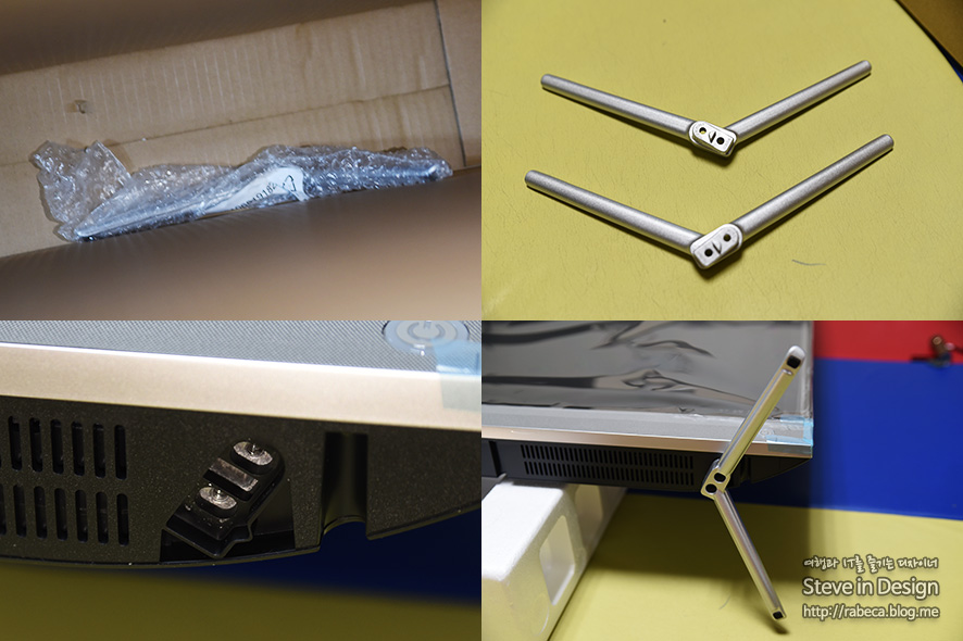사실 박스를 열고는 조금 당황했었던 부분이 있습니다. 바로 받침대가 보이지 않아서 그랬는데요, 받침대가 들어올린 박스커버쪽에 붙어 있더군요 그래서 처음에는 구성품이 누락되었나? 이렇게 생각했었습니다. 받침대가 필요없다면 400*200 베사홀을 지원하기 때문에 벽걸이로도 설치는 가능합니다. 그리고 받침대는 방향이 조금 있으니 설치할 때 방향에 대한 주의가 필요해 보입니다.